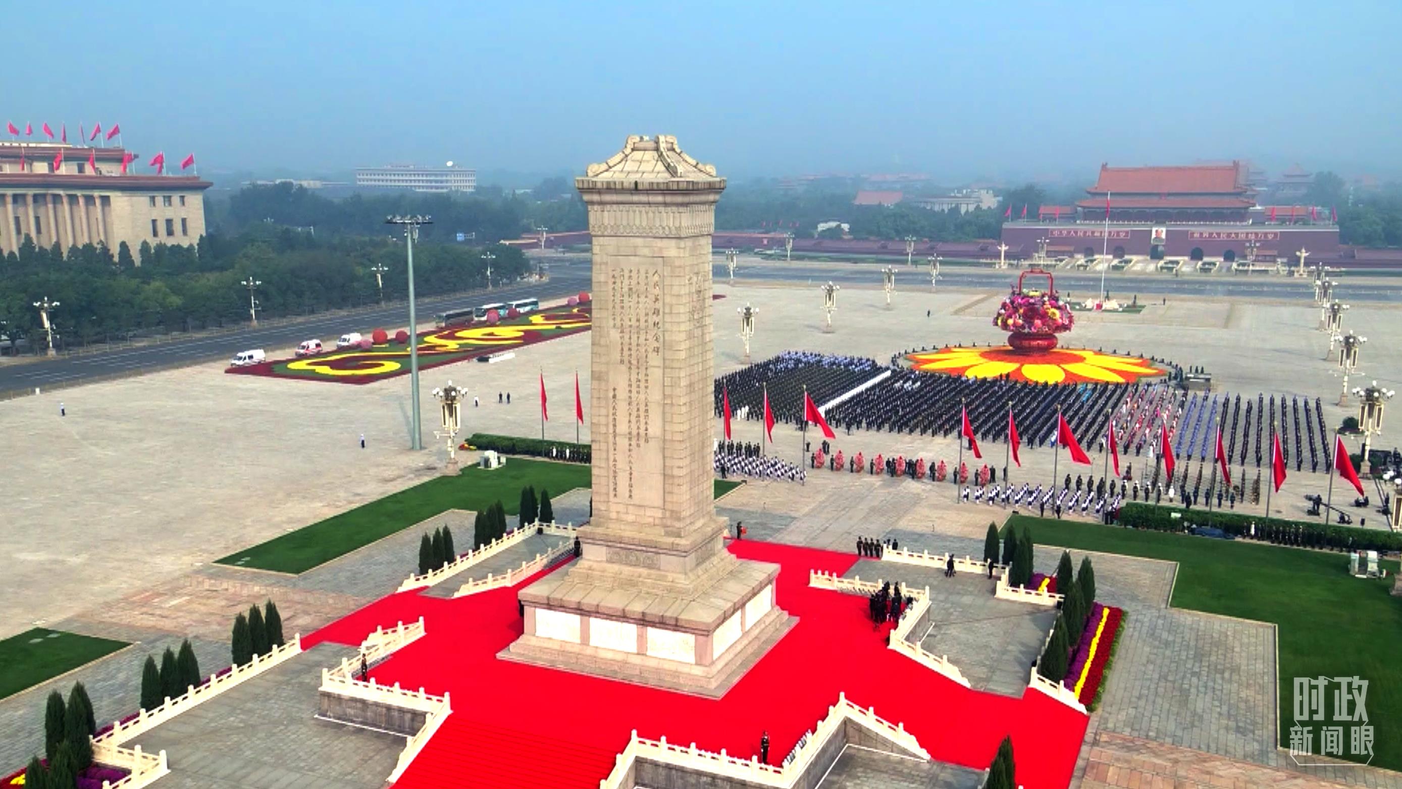 △現(xiàn)場的9個花籃由18名禮兵抬至紀念碑基座上。(總臺央視記者羅曉丹、鐘信偉拍攝)