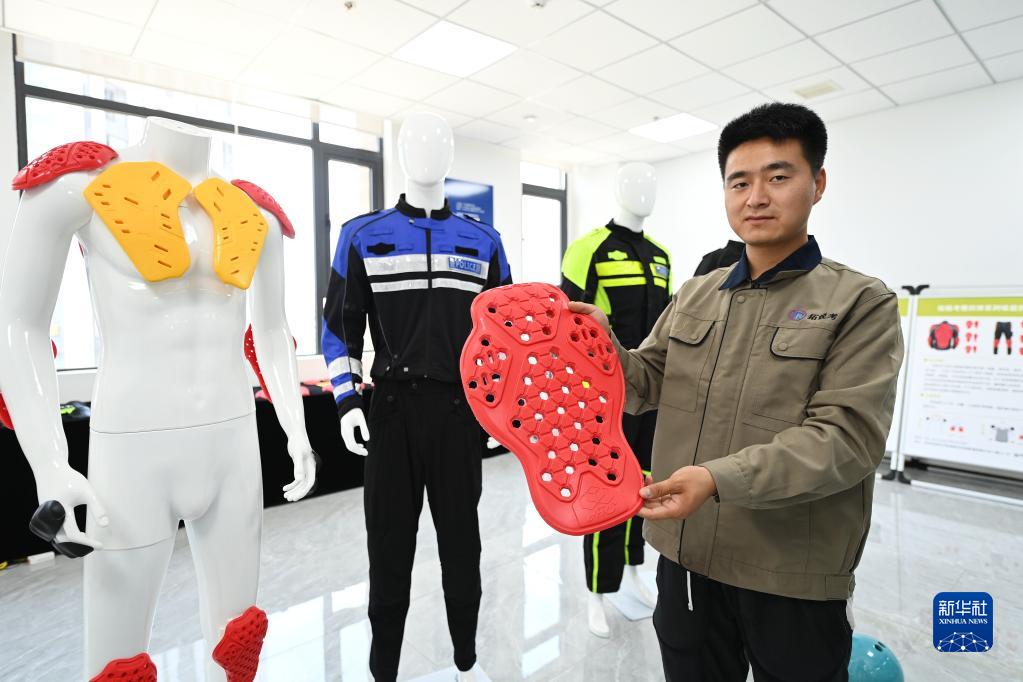在位于秦創(chuàng)原總窗口所在地陜西省西咸新區(qū)的陜西拓銳考新材料科技有限公司,工作人員展示自主研發(fā)的納米智能吸能慢回彈護具(2022年6月17日攝)。新華社記者 李一博 攝