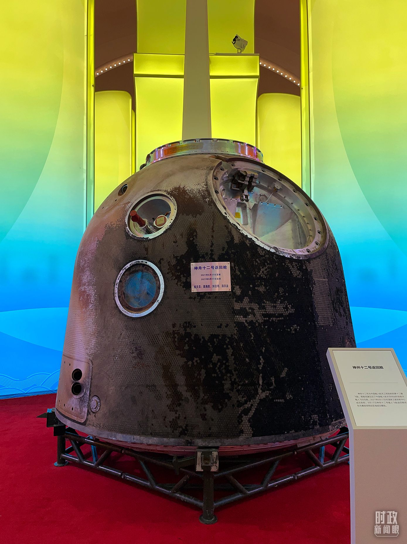 △“奮進(jìn)新時代”主題成就展上,神舟十二號返回艙展示。(總臺央視記者彭漢明拍攝)