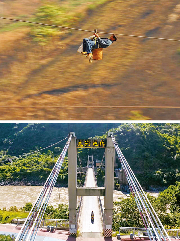 “過江靠溜索”曾是怒江兩岸群眾出行的重要方式。2013年,國(guó)家實(shí)施“溜索改橋”項(xiàng)目,幫助西部邊遠(yuǎn)山區(qū)群眾結(jié)束溜索時(shí)代,怒江州怒江段上溜索被改造為各式跨江橋梁,完成了沿江人民“天塹變通途”的企盼。上圖為2013年2月2日,在云南省怒江州瀘水市六庫(kù)街道,一名居民背著背簍溜索過江(新華社記者 王長(zhǎng)山/攝)。下圖為2022年9月13日,瀘水市居民騎摩托車通過大興地橋(無人機(jī)照片,新華社記者 江文耀/攝)。