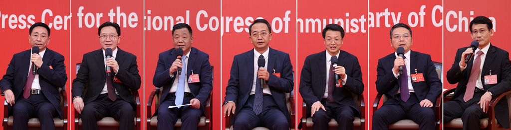 10月19日,中國(guó)共產(chǎn)黨第二十次全國(guó)代表大會(huì)新聞中心舉行集體采訪。山東、河南、湖北、湖南、廣東、廣西、海南代表團(tuán)新聞發(fā)言人出席,介紹代表團(tuán)學(xué)習(xí)討論二十大報(bào)告情況,并回答記者提問(拼版照片)。新華社記者 張玉薇 攝