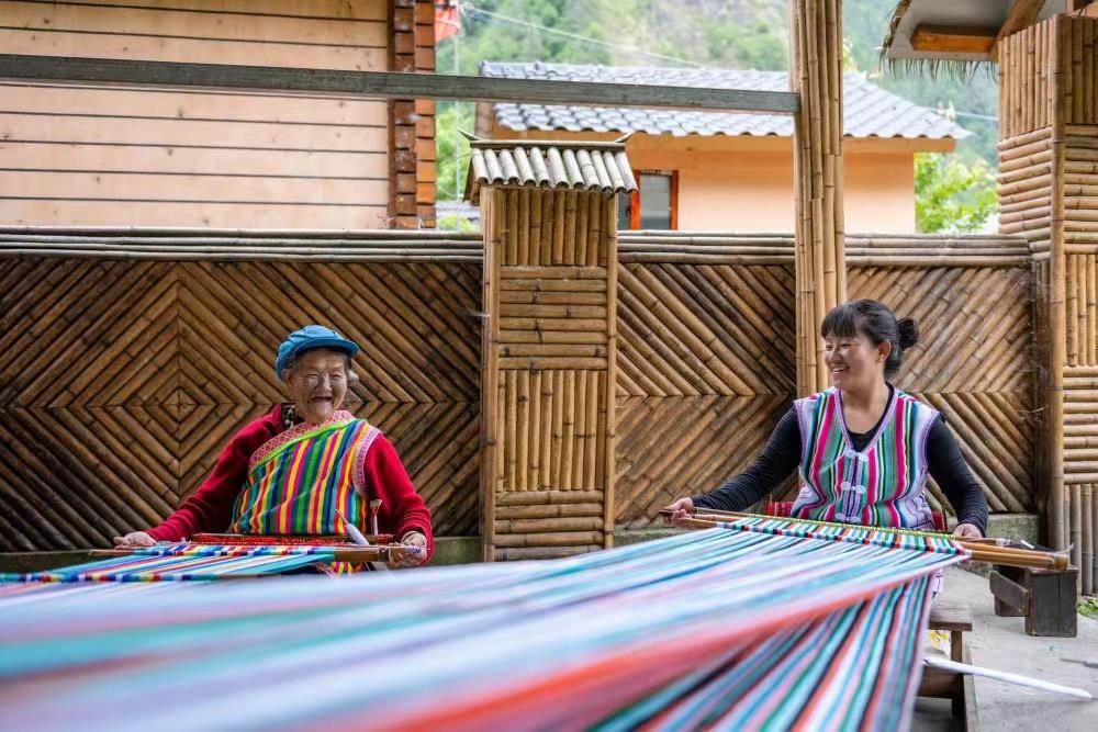 △云南怒江貢山縣獨(dú)龍江鄉(xiāng)獨(dú)龍族老人李文仕(左)和女兒在編織獨(dú)龍?zhí)骸?/p>