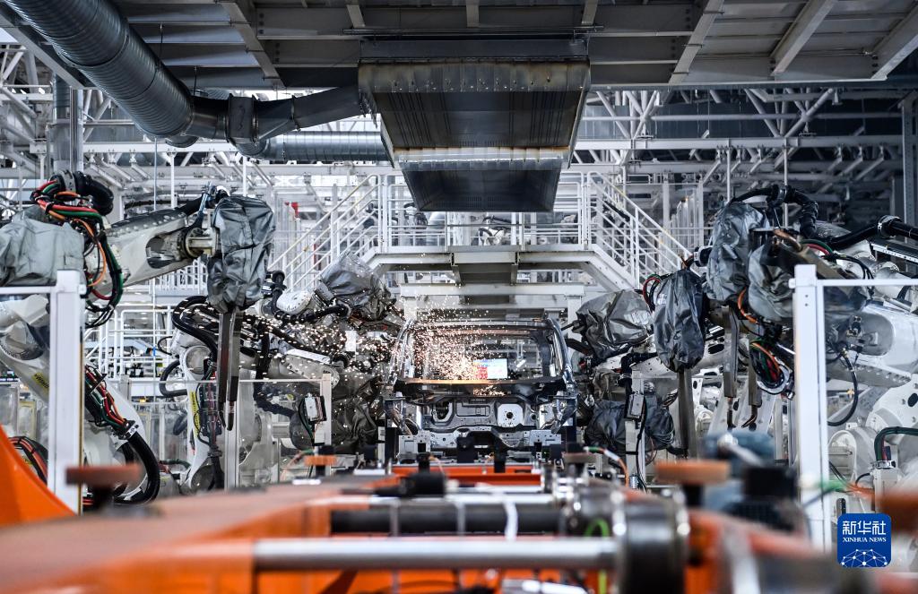 10月17日,在吉林長(zhǎng)春中國(guó)第一汽車(chē)集團(tuán)有限公司紅旗繁榮工廠焊裝車(chē)間內(nèi),焊裝機(jī)器人在生產(chǎn)線上焊接車(chē)身。新華社記者 顏麟蘊(yùn) 攝