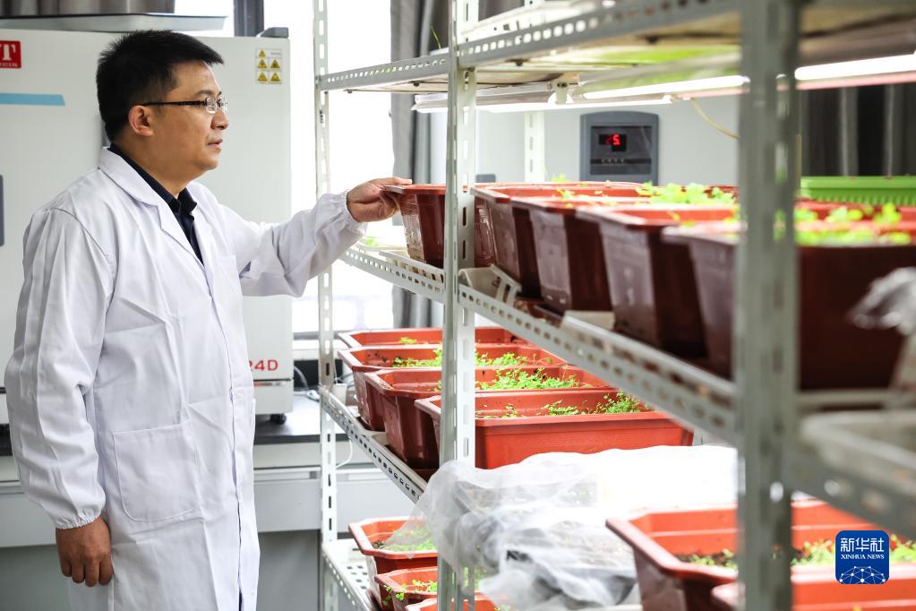 10月20日,貴州大學(xué)動(dòng)物科學(xué)學(xué)院院長陳超在實(shí)驗(yàn)室內(nèi)觀察新品種牧草的生長情況。新華社記者 歐東衢 攝