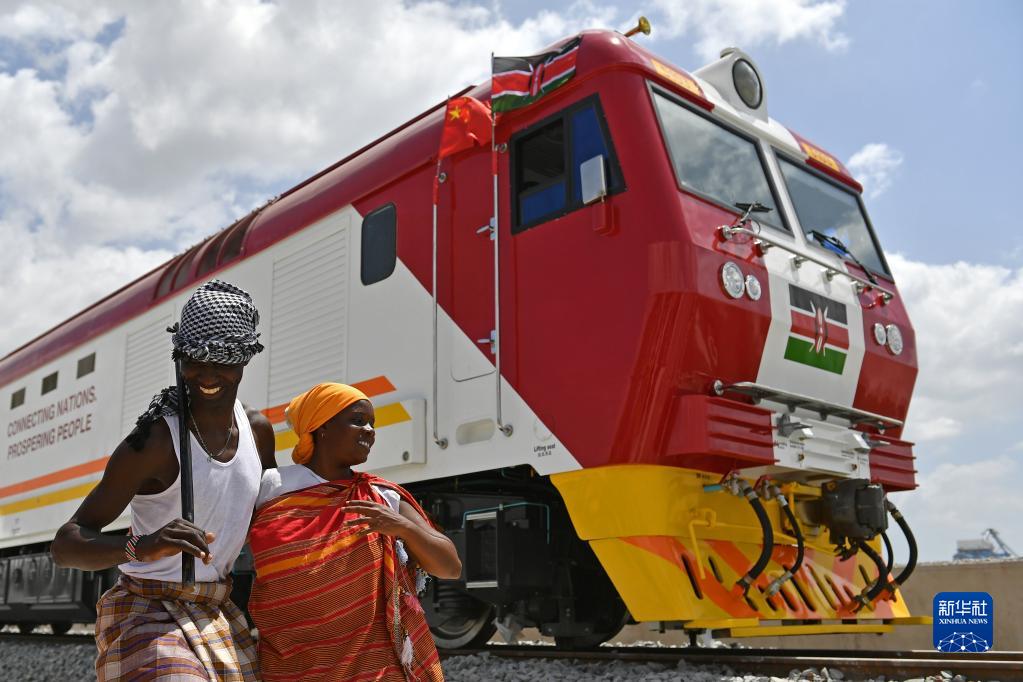 在肯尼亞蒙巴薩,當?shù)孛癖娫谥袊兄频拿蓛?nèi)鐵路首批內(nèi)燃機車旁載歌載舞(2017年1月11日攝)。新華社記者 孫瑞博 攝
