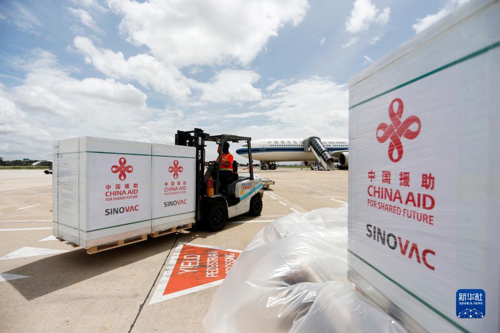 工作人員在柬埔寨金邊國際機場運輸中國政府援助柬埔寨的科興新冠疫苗(2021年10月14日攝)。新華社發(fā)(批隆 攝)