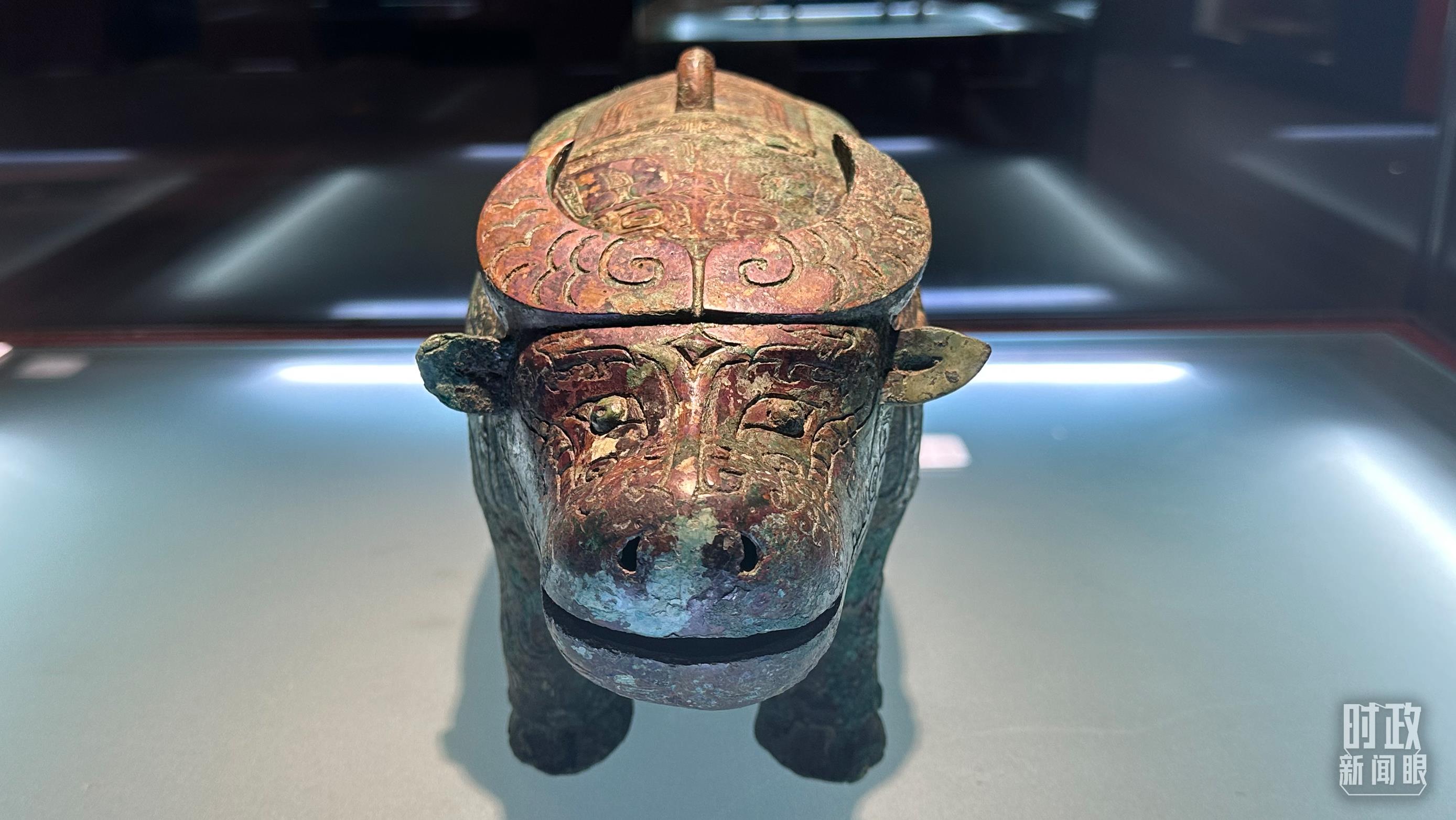 △這是殷墟博物館的另一個(gè)鎮(zhèn)館之寶——亞長(zhǎng)牛尊,是殷墟唯一一件牛形青銅尊。(總臺(tái)央視記者范一鳴拍攝)