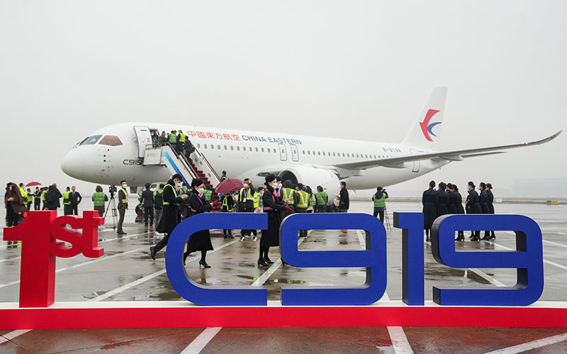 △國產(chǎn)大飛機(jī)C919停在上海虹橋機(jī)場停機(jī)坪上(12月9日攝)。