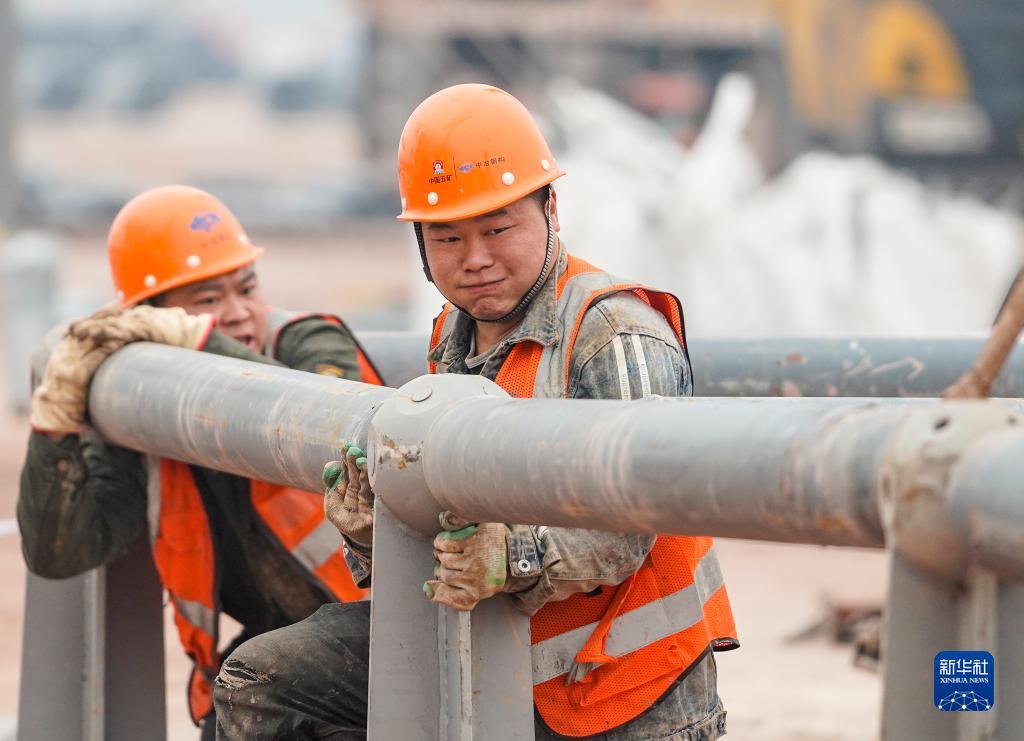 工人在重慶兩江新區(qū)新能源汽車產(chǎn)業(yè)園基礎(chǔ)設(shè)施配套項(xiàng)目現(xiàn)場(chǎng)進(jìn)行鋼結(jié)構(gòu)材料拼裝作業(yè)(1月23日攝)。新華社記者 劉潺 攝