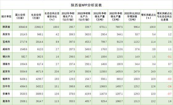 全省元生產(chǎn)力區(qū)域分析結(jié)果表明,在三大區(qū)域生態(tài)蛋糕越來越大的同時,生態(tài)蛋糕的空間布局上與結(jié)構(gòu)發(fā)生變化,呈現(xiàn)黃河流域綠色崛起大趨勢。陜北榆林、延安兩市,生態(tài)空間8971.6萬畝,占全省的39.6%;關(guān)中西安、寶雞、咸陽、渭南、銅川五市生態(tài)空間4554.5萬畝,占全省的29.2%;陜南漢中、安康、商洛三市生態(tài)空間9136.2萬畝,占全省的40.2%。2022年,陜北兩市提供了2070.9萬噸植被凈初級生產(chǎn)量,占全省的26.9%,比2012年的1714.1萬噸增加313.8萬噸,增長18.3%,在全省份額上升了1.3個百分點;關(guān)中五市提供了1775.1萬噸的植被凈初級生產(chǎn)量,占全省的23.1%,比2012年的1524.3萬噸250.8萬噸,增長16.4%,在全省份額上升了0.3個百分點;陜南三市提供了3851.5萬噸植被凈初級生產(chǎn)量,占全省的50.0%,比2012年的3462.7萬噸增加388.8萬噸,增長11.2%,在全省份額下降了1.6個百分點。2012-2022年全省新增生態(tài)蛋糕996.4萬噸,陜北兩市貢獻(xiàn)31.5%,關(guān)中五市貢獻(xiàn)29.5%,陜南三市貢獻(xiàn)39.0%。陜北、關(guān)中提供的生態(tài)蛋糕占全省的份額已由2012年的48.4%提高到2022年的50.0%。