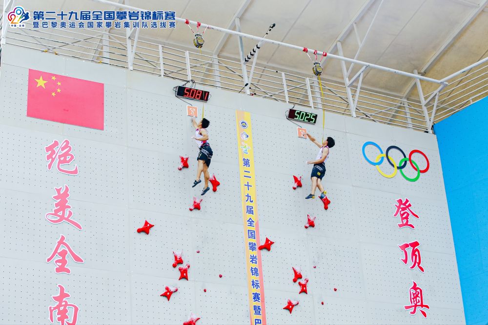 19日,本屆錦標(biāo)賽男子、女子速度賽開賽。男子項目走向頗具戲劇性。預(yù)賽中,上賽季國際攀聯(lián)世界杯維拉爾站冠軍龍見國在預(yù)賽中就爬出5秒04,將其國家隊隊友龍金寶保持的該項目全國紀(jì)錄提高了百分之一秒。決賽的八進(jìn)四輪,龍見國再次爬出5秒04。但半決賽與龍金寶相遇時,他卻因失誤被淘汰,無奈進(jìn)入三、四名決賽。