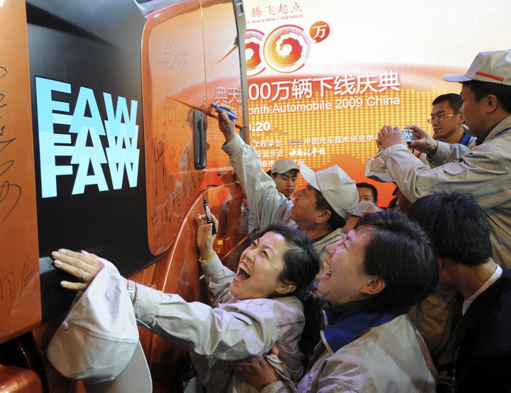 2009年10月20日,一汽解放的工人們?cè)谧约河H手生產(chǎn)的2009年中國(guó)第1000萬(wàn)輛車(chē)上簽名。新華社記者 蔣林 攝