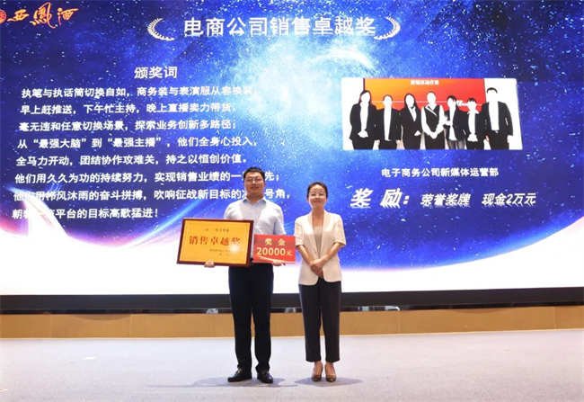 西鳳股份公司總經(jīng)理助理趙永紅為市級經(jīng)理銷售卓越獎獲得者頒發(fā)榮譽證書與獎金