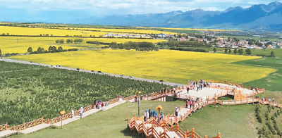 7月,青海省門源回族自治縣油菜花綻放,一蓬蓬、一簇簇迎風(fēng)舞動(dòng),宛如金色的海洋。付利攝 |