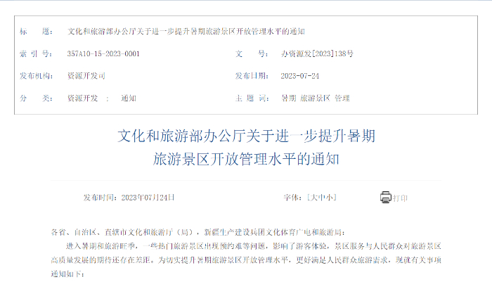 通知中稱,進入暑期和旅游旺季,一些熱門旅游景區(qū)出現(xiàn)預(yù)約難等問題,影響了游客體驗,景區(qū)服務(wù)與人民群眾對旅游景區(qū)高質(zhì)量發(fā)展的期待還存在差距。為切實提升暑期旅游景區(qū)開放管理水平,更好滿足人民群眾旅游需求,現(xiàn)就有關(guān)事項通知如下: