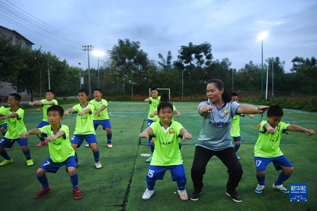 8月7日晚,孩子們在足球場上進(jìn)行訓(xùn)練(無人機(jī)照片)。