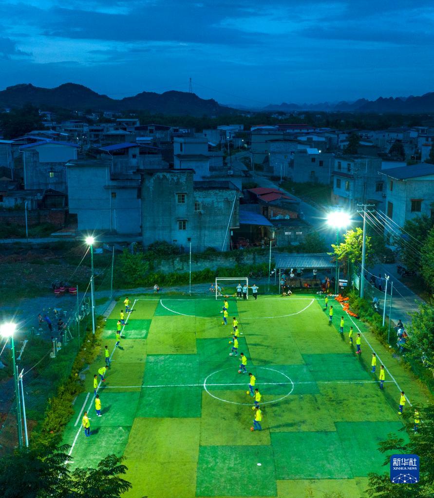 平地屯是位于廣西柳州市柳江區(qū)穿山鎮(zhèn)的一個小山村。8月7日晚,為期近1個月的平地屯暑期公益足球夏令營結(jié)束,一場匯報訓(xùn)練成果的足球?qū)官愒诖謇锏木G茵場上打響,吸引眾多村民觀賽。2020年,平地屯的村民組成義務(wù)勞動隊,為孩子們修建專用足球場,社會愛心人士為他們捐贈了人工草坪、球門、球場照明燈等設(shè)施,公益足球教練定期免費(fèi)為孩子們培訓(xùn),眾人聯(lián)合起來,給村里喜歡足球的孩子們點燃了綠茵夢想。