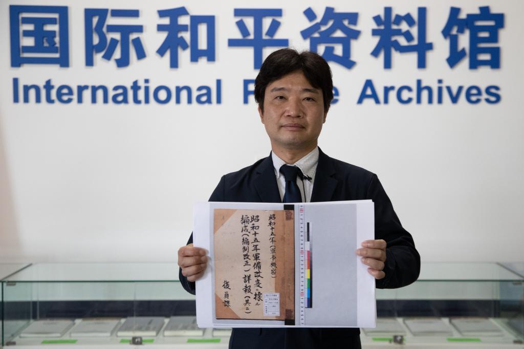 6月1日,在黑龍江外國語學院國際和平資料館,日本學者松野誠也展示新發(fā)現(xiàn)的資料。此前,黑龍江外國語學院和侵華日軍第七三一部隊罪證陳列館聯(lián)合在哈爾濱市向社會公布了一批部隊編制資料。這些資料包括關東軍防疫給水部軍官高等文官職員表、判任文官同待遇者職員表等。新華社記者張濤攝