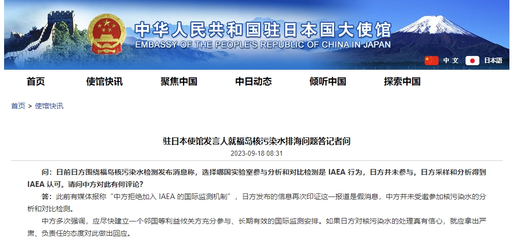 央視網(wǎng)消息:據(jù)中國駐日本大使館網(wǎng)站消息,駐日本使館發(fā)言人就福島核污染水排海問題答記者問。內(nèi)容如下: