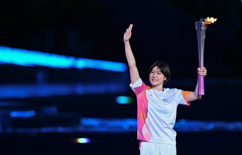 9月23日,火炬手葉詩(shī)文在開(kāi)幕式上進(jìn)行火炬?zhèn)鬟f。新華社記者 李一博 攝