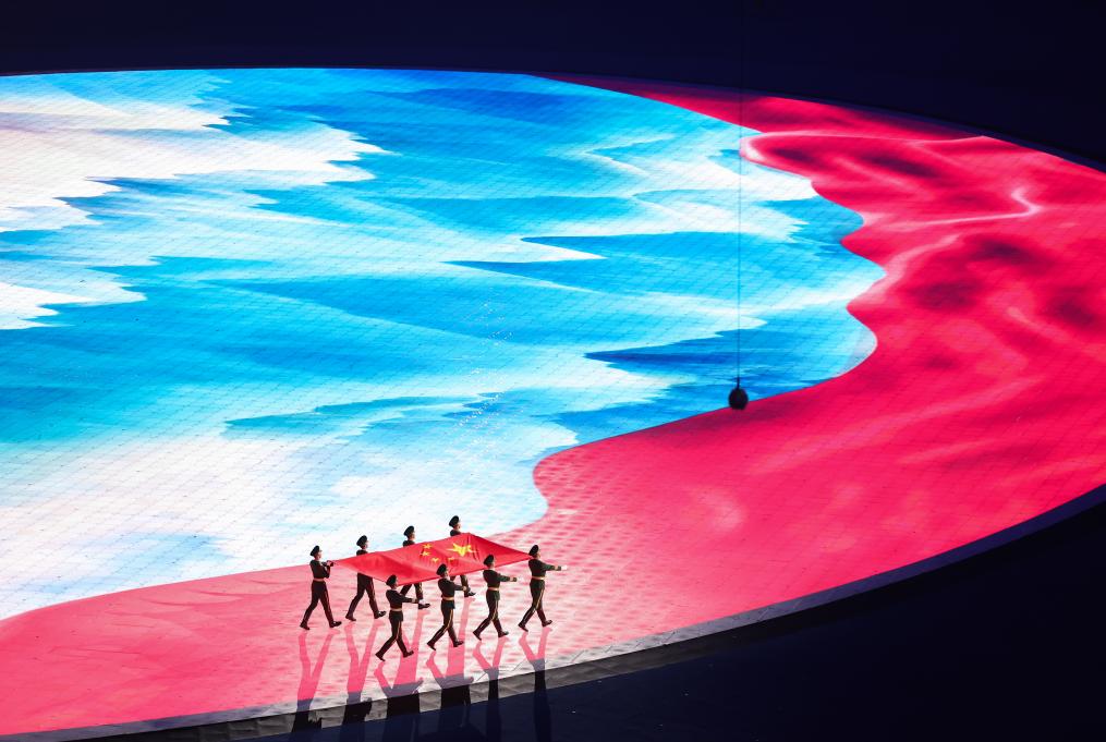 地屏上,一幅紅綢飛掠壯麗河山。8名儀仗兵步伐鏗鏘,護(hù)旗入場(chǎng)。“我愛(ài)你中國(guó),我愛(ài)你春天蓬勃的秧苗……”動(dòng)人的贊歌深情唱響。