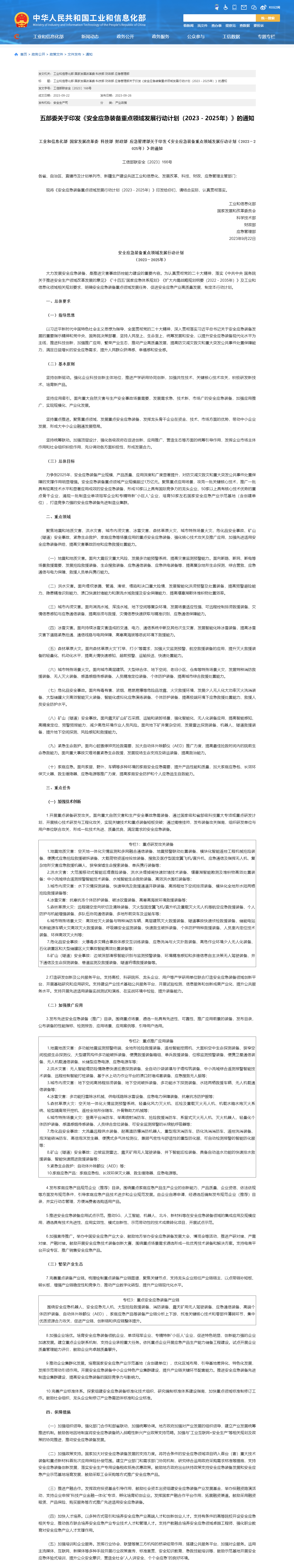 工信部官網(wǎng)消息,近日,工業(yè)和信息化部、國家發(fā)展改革委、科技部、財(cái)政部、應(yīng)急管理部等五部門聯(lián)合印發(fā)《安全應(yīng)急裝備重點(diǎn)領(lǐng)域發(fā)展行動(dòng)計(jì)劃(2023-2025年)》。其中提出,力爭(zhēng)到2025年,安全應(yīng)急裝備產(chǎn)業(yè)規(guī)模、產(chǎn)品質(zhì)量、應(yīng)用深度和廣度顯著提升,對(duì)防災(zāi)減災(zāi)救災(zāi)和重大突發(fā)公共事件處置保障的支撐作用明顯增強(qiáng)。安全應(yīng)急裝備重點(diǎn)領(lǐng)域產(chǎn)業(yè)規(guī)模超過1萬億元。聚焦重點(diǎn)應(yīng)用場(chǎng)景,攻克一批關(guān)鍵核心技術(shù),推廣一批具有較高技術(shù)水平和顯著應(yīng)用成效的安全應(yīng)急裝備,形成10家以上具有國際競(jìng)爭(zhēng)力的龍頭企業(yè)、50家以上具有核心技術(shù)優(yōu)勢(shì)的重點(diǎn)骨干企業(yè),涌現(xiàn)一批制造業(yè)單項(xiàng)冠軍企業(yè)和專精特新“小巨人”企業(yè),培育50家左右國家安全應(yīng)急產(chǎn)業(yè)示范基地(含創(chuàng)建單位),打造競(jìng)爭(zhēng)力強(qiáng)的安全應(yīng)急裝備先進(jìn)制造業(yè)集群。