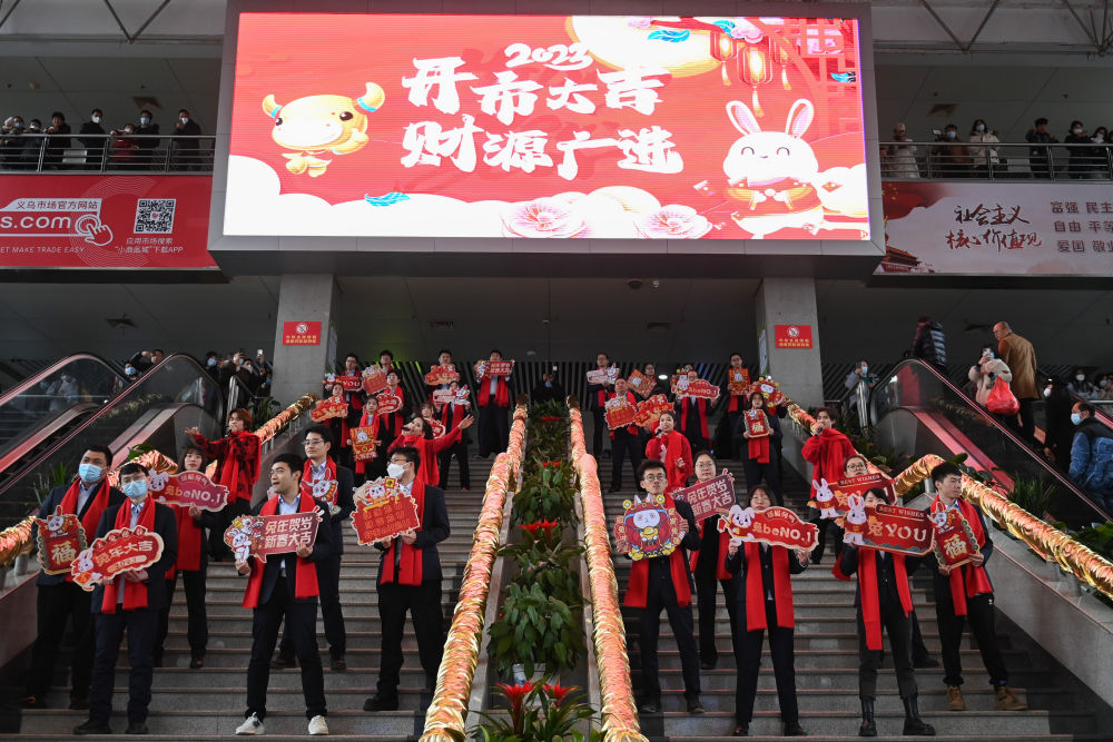 商戶(hù)代表在義烏國(guó)際商貿(mào)城的大廳進(jìn)行文藝表演(2023年2月2日攝)。新華社記者 黃宗治 攝