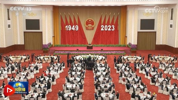 人民大會堂宴會廳華燈璀璨、鮮花綻放,洋溢著喜慶熱烈的節(jié)日氛圍。主席臺上方高懸著莊嚴(yán)的國徽,“1949-2023”大字年號在鮮艷的紅旗映襯下格外醒目。