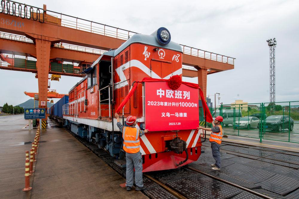 △2023年7月29日,滿(mǎn)載110個(gè)標(biāo)箱出口貨物的X8020次中歐班列從浙江義烏西站準(zhǔn)備啟程。