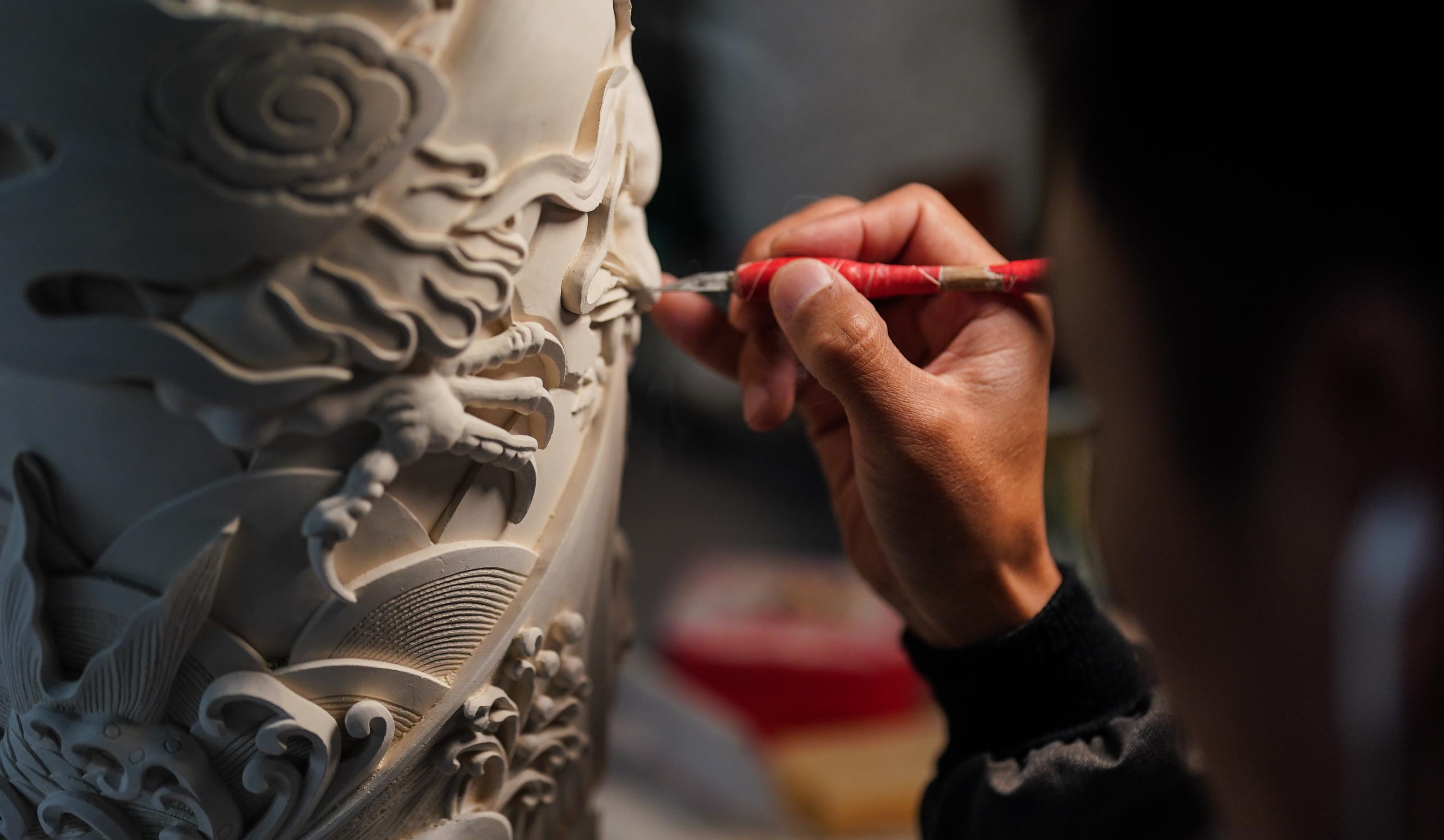 △景德鎮(zhèn)工匠在進(jìn)行陶瓷雕刻。(總臺國廣記者李晉拍攝)
