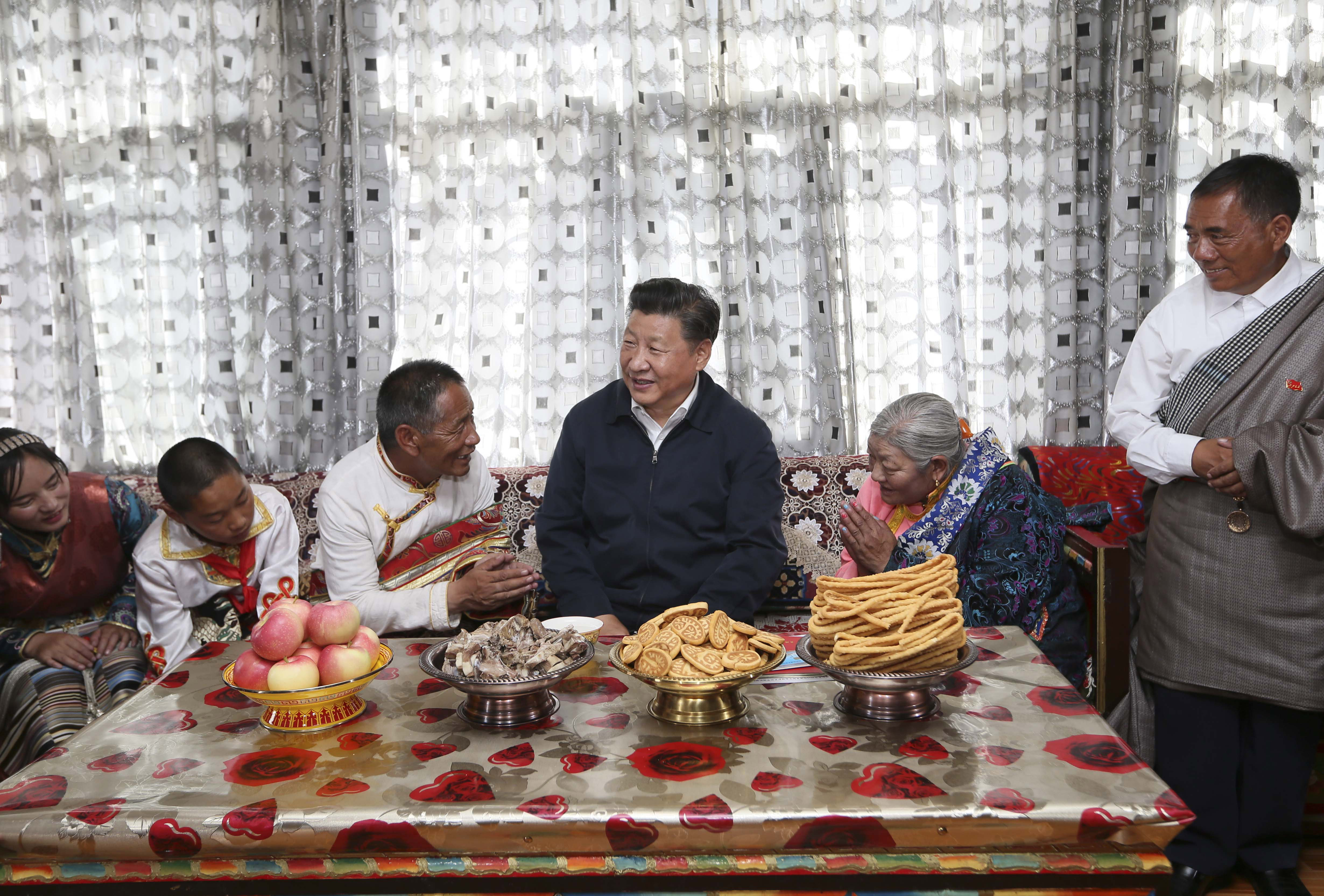2016年8月22日,習(xí)近平在青海海西蒙古族藏族自治州格爾木市唐古拉山鎮(zhèn)長江源村藏族村民申格家中同一家人親切交談。