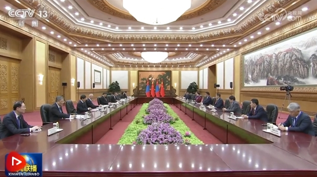 10月19日上午,國(guó)家主席習(xí)近平在人民大會(huì)堂會(huì)見(jiàn)來(lái)華出席第三屆“一帶一路”國(guó)際合作高峰論壇的蒙古國(guó)總統(tǒng)呼日勒蘇赫。