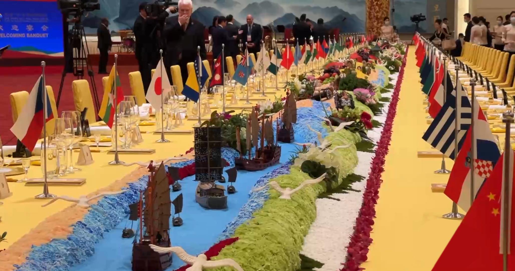 在10月17日晚舉行的歡迎宴會上,嘉賓們被這樣一個細(xì)節(jié)深深打動——晚宴餐臺以“撫古觀今、擁抱未來”為主題,南側(cè)展示著古代絲綢之路的微觀景象:海邊碼頭上擺放著對外出口的瓷器、絲綢、茶葉等貿(mào)易物資,路上擺放有從西域引進(jìn)的蔬菜瓜果;餐臺北側(cè)為21世紀(jì)絲綢之路的景觀:以北京天壇的裝飾為起點,中間穿插高鐵、中歐班列、新能源汽車等擺件,展現(xiàn)各國互聯(lián)互通的景象……