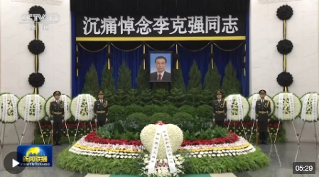2日上午,八寶山革命公墓禮堂莊嚴肅穆,哀樂低回。正廳上方懸掛著黑底白字的橫幅“沉痛悼念李克強同志”,橫幅下方是李克強同志的遺像。李克強同志的遺體安臥在鮮花翠柏叢中,身上覆蓋著鮮紅的中國共產黨黨旗。