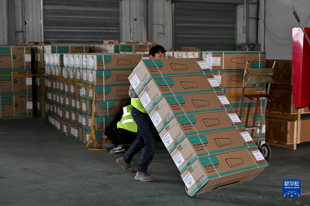11月4日,在阿拉山口綜合保稅區(qū)內的跨境電子商務分揀清關中心,工作人員將國產(chǎn)空調裝車準備運往國外。新華社記者 李鑫 攝