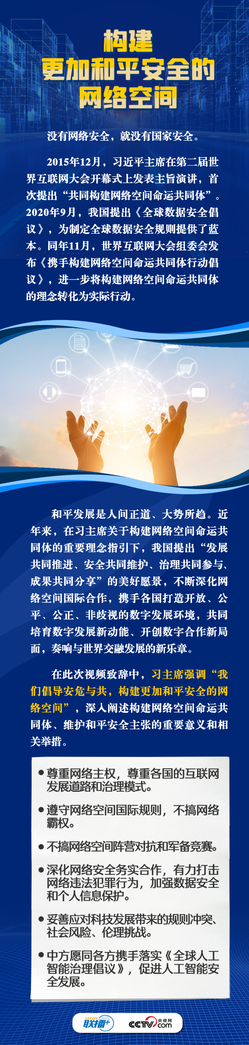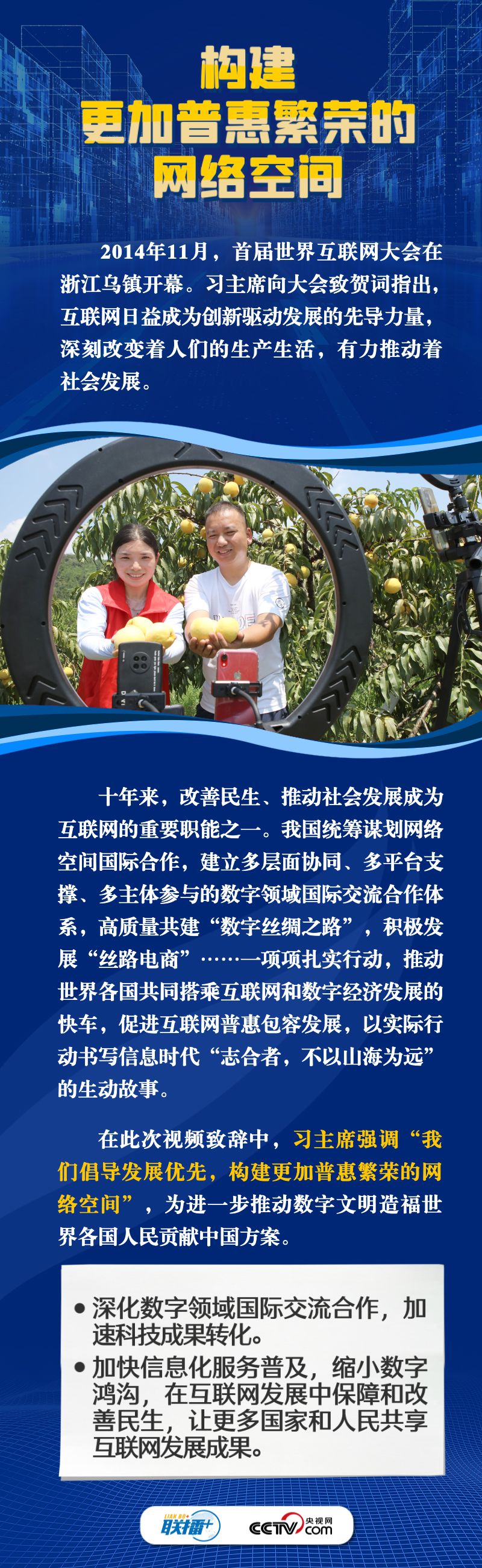 聯(lián)播+ 11月8日,習(xí)近平主席向2023年世界互聯(lián)網(wǎng)大會(huì)烏鎮(zhèn)峰會(huì)開幕式發(fā)表視頻致辭。自2014年首屆世界互聯(lián)網(wǎng)大會(huì)舉辦以來(lái),習(xí)主席通過(guò)發(fā)表主旨演講、視頻致辭或者向大會(huì)發(fā)來(lái)賀信等不同形式關(guān)心大會(huì)的舉辦,始終倡導(dǎo)構(gòu)建網(wǎng)絡(luò)空間命運(yùn)共同體,得到國(guó)際社會(huì)廣泛認(rèn)同和積極響應(yīng)。