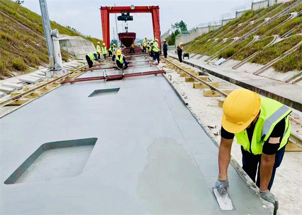 梅龍高鐵時速350公里,采用的是CRTS雙塊式無砟軌道結(jié)構(gòu),從上到下由鋼軌、扣件、軌枕、道床板、隔離層和底座等部分組成,無砟軌道的平整度決定著列車行駛的平穩(wěn)性和舒適性?;炷寥肽囟软毧刂圃?——30攝氏度才能確保質(zhì)量,為此項目部將施工作業(yè)時間進行了調(diào)整,避開高溫時段,選在溫度偏低的早上和夜間施工,混凝土澆筑則在深夜溫度最低的時候進行;確保無砟軌道施工質(zhì)量。