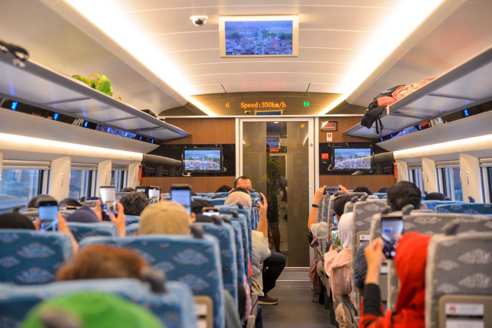 △2023年11月5日,在行駛中的雅萬高鐵高速動車組列車車廂內(nèi),乘客紛紛用手機(jī)拍攝顯示列車時速達(dá)到350公里的電子屏。