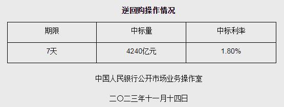 據(jù)央行網(wǎng)站消息,為維護(hù)銀行體系流動性合理充裕,2023年11月14日人民銀行以利率招標(biāo)方式開展了4240億元逆回購操作,中標(biāo)利率1.80%,期限為7天。具體情況如下: