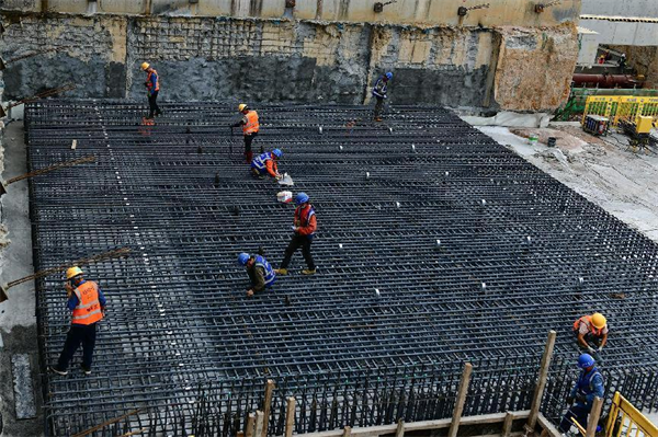 照此安排,項(xiàng)目部各部門、作業(yè)隊(duì)既各自為戰(zhàn),又協(xié)調(diào)統(tǒng)一,按區(qū)域、分專業(yè)、依先后齊頭并進(jìn)。筆者在地面施工區(qū)域看到,盾構(gòu)井臨時(shí)封堵板的鋼筋綁扎已經(jīng)完成,8名作業(yè)人員和監(jiān)理、技術(shù)人員在做最后的檢查,混凝土罐車、泵車嚴(yán)陣以待……不一會(huì)兒,混凝土順著管子就流向了鋼筋網(wǎng)內(nèi),4名振搗工也隨之開始忙碌,嗡嗡聲響成一片。車站1號鋼筋場,10幾名穿著印有“鋼筋工”“信號司索工”馬甲的工人,或協(xié)助吊車調(diào)運(yùn)鋼筋、或切割鋼筋原材下料;不遠(yuǎn)處,吊車調(diào)運(yùn)明挖段鋼支撐轉(zhuǎn)場……