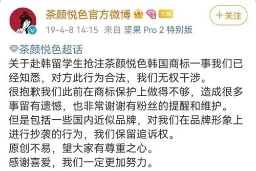 無獨有偶,茶顏悅色也曾遇到過類似的海外商標(biāo)搶注事件。2018年,一位出生在長沙的赴韓留學(xué)生,在韓國搶注了茶顏悅色的商標(biāo),開起了店。