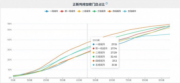 從極海品牌監(jiān)測的數(shù)據(jù)來看,在門店占比超過50%的三四五線城市里,正新門店位于“已有門店周圍500米”距離的“加密門店”的占比都超過30%,其中,四線城市甚至超過37%。在深圳,界面新聞留意到,在華強北附近,也依然存在正新雞排相距100米“緊挨”著開店的現(xiàn)狀。