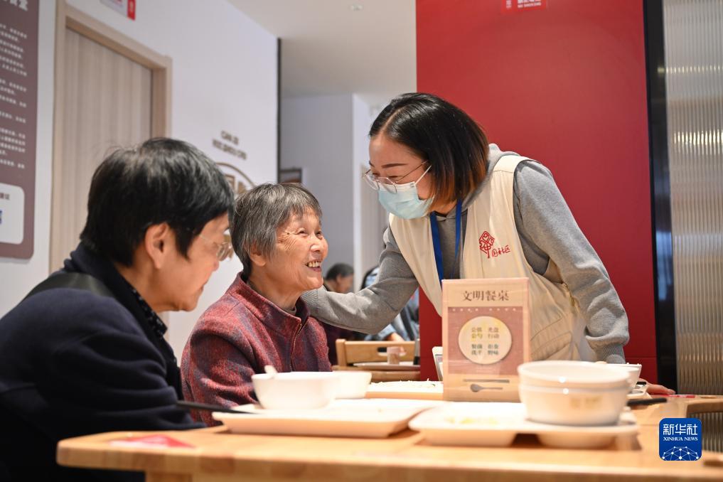 2023年11月16日,社區(qū)工作人員在福州市鼓樓區(qū)慶城社區(qū)長(zhǎng)者食堂內(nèi)與用餐老人交流。新華社記者 姜克紅 攝