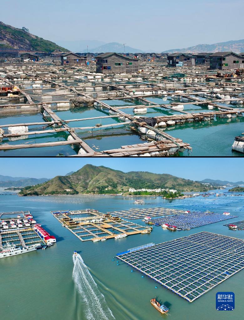 拼版照片:上圖為2007年7月拍攝的福建寧德三都澳海域傳統(tǒng)漁排(資料照片);下圖為2023年11月18日拍攝的福建寧德七星海域升級(jí)改造后的漁業(yè)養(yǎng)殖區(qū)(無(wú)人機(jī)照片,新華社記者姜克紅攝)。新華社發(fā)