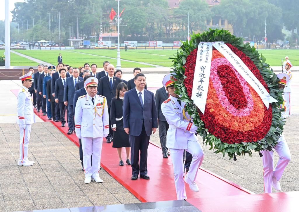 13日上午,習近平總書記在河內(nèi)瞻仰胡志明陵并敬獻花圈。