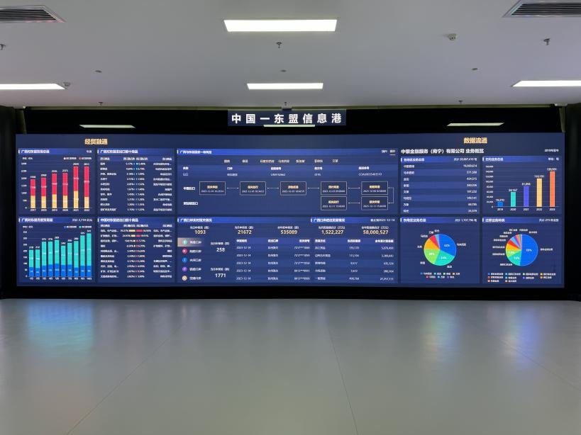 在中國—東盟信息港數(shù)字經(jīng)濟(jì)展示中心,3米高的電子顯示屏上,邊民互市貿(mào)易的數(shù)字在不斷跳動。這個集交易、通關(guān)、金融和物流為一體的中國—東盟“商貿(mào)通”數(shù)字化平臺,可以為客戶提供跨境貿(mào)易全鏈條、數(shù)字化、一站式綜合服務(wù),實現(xiàn)邊民互市當(dāng)天交易、當(dāng)天通關(guān)。