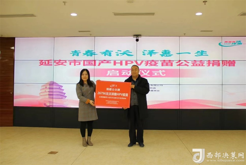 西部決策網(wǎng)訊(記者劉玉 齊春梅)為進(jìn)一步推動(dòng)延安市宮頸癌防治工作,從源頭上降低患病機(jī)率,提高全市婦女健康水平,12月15日下午,延安市衛(wèi)健委舉行“青春有沃 澤惠一生”國(guó)產(chǎn)HPV疫苗公益捐贈(zèng)儀式。延安市衛(wèi)健委黨委書(shū)記、主任胡生凡,市慈善協(xié)會(huì)副會(huì)長(zhǎng)馬發(fā)義、玉溪澤潤(rùn)生物科技有限公司相關(guān)負(fù)責(zé)人參加捐贈(zèng)儀式。