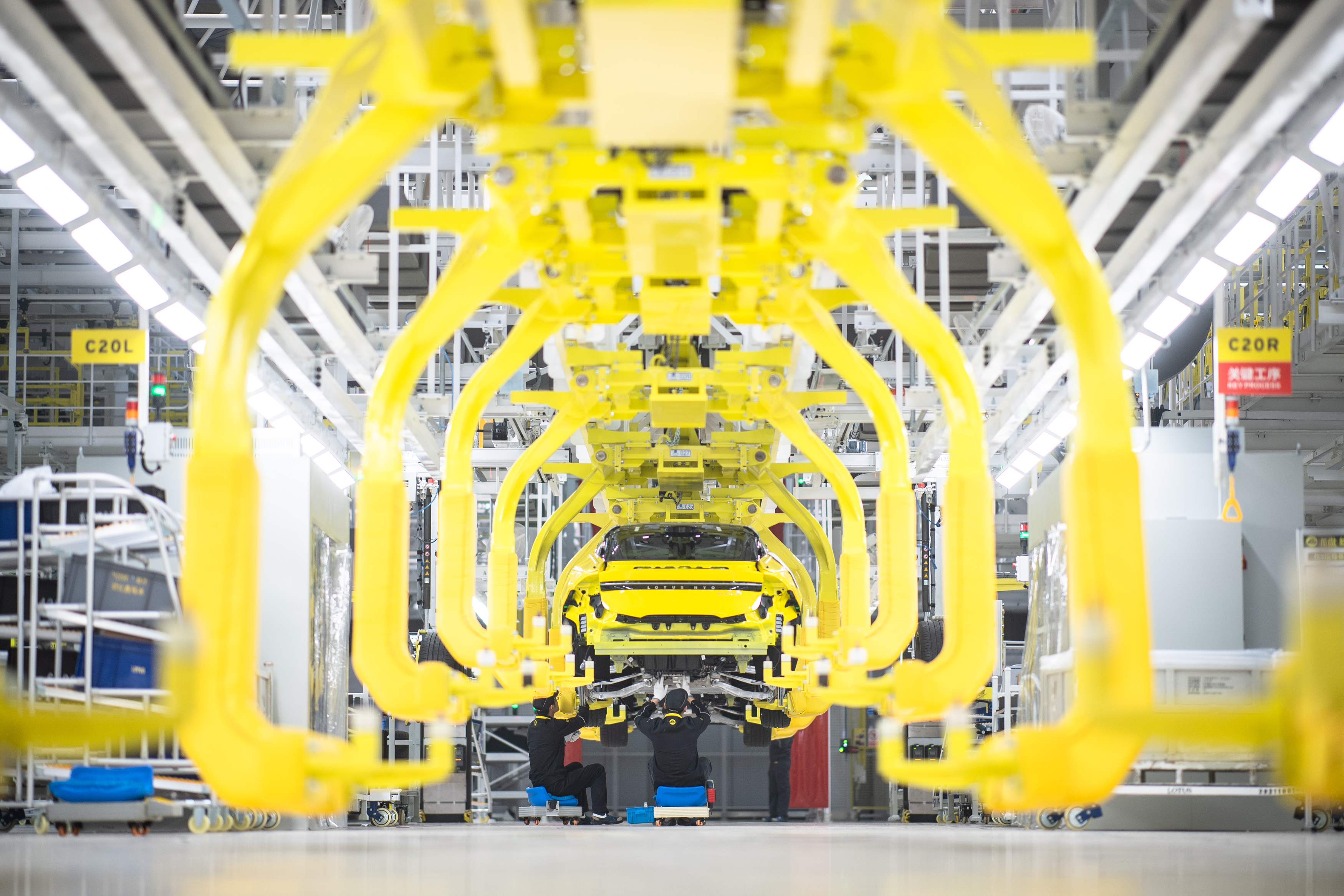 在位于湖北省武漢市經(jīng)開區(qū)智能網(wǎng)聯(lián)和電動汽車產(chǎn)業(yè)園的路特斯全球智能工廠,工人在流水線上作業(yè)(2023年1月11日攝)。新華社記者 肖藝九 攝