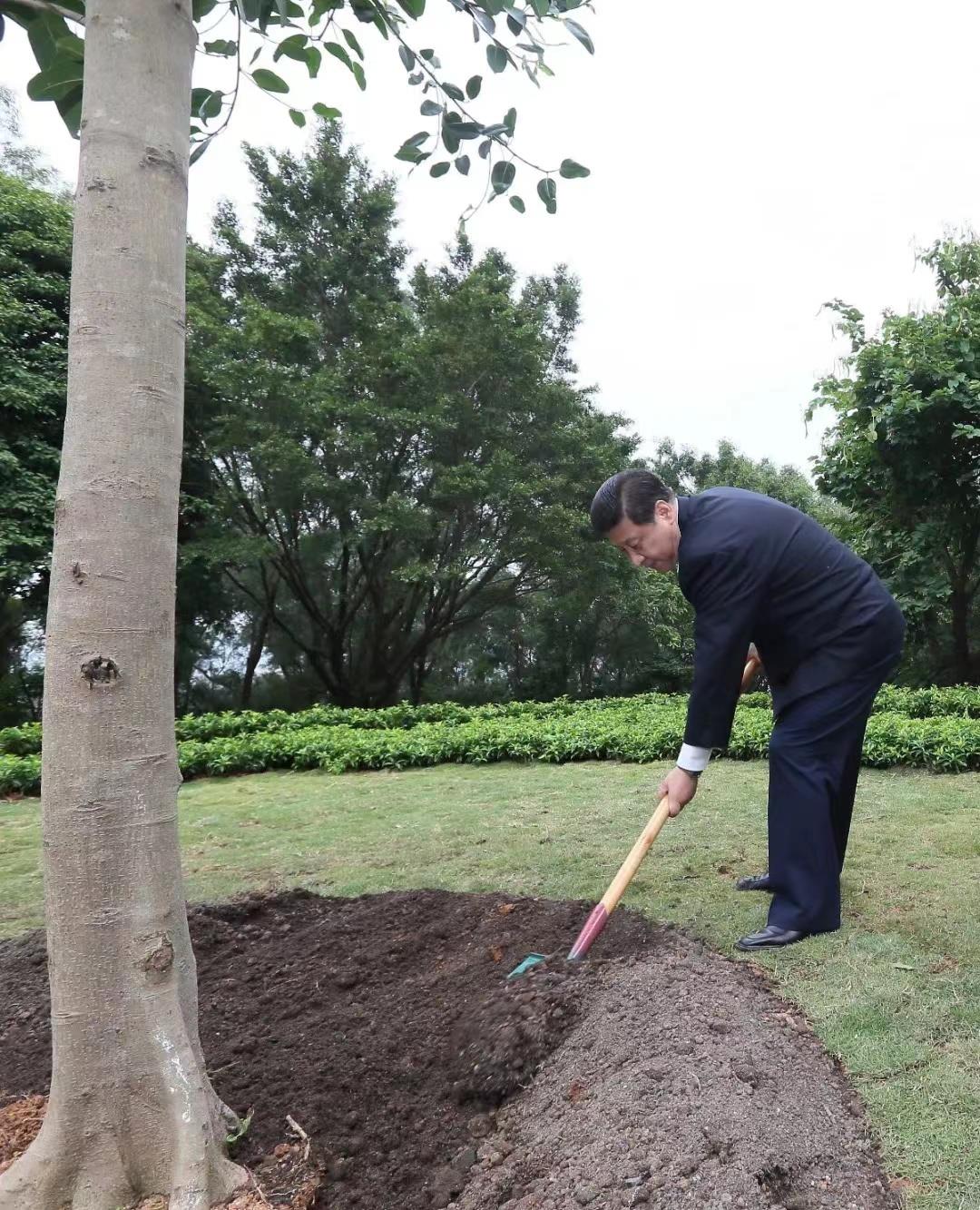 △2012年12月8日,習(xí)近平總書記在深圳蓮花山公園,向鄧小平銅像敬獻(xiàn)花籃。離開前,他揮鍬鏟土,種下一棵高山榕樹。