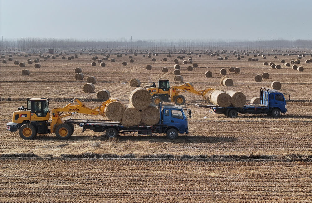 ↑河北省唐山市曹妃甸區(qū)第八農(nóng)場田間,稻草回收企業(yè)的工人將打好捆的稻草裝車(無人機照片,12月10日攝)。曹妃甸區(qū)通過將稻草集中收集用于生物質(zhì)發(fā)電、牲畜飼料和有機肥生產(chǎn),有效提高了秸稈綜合利用率。